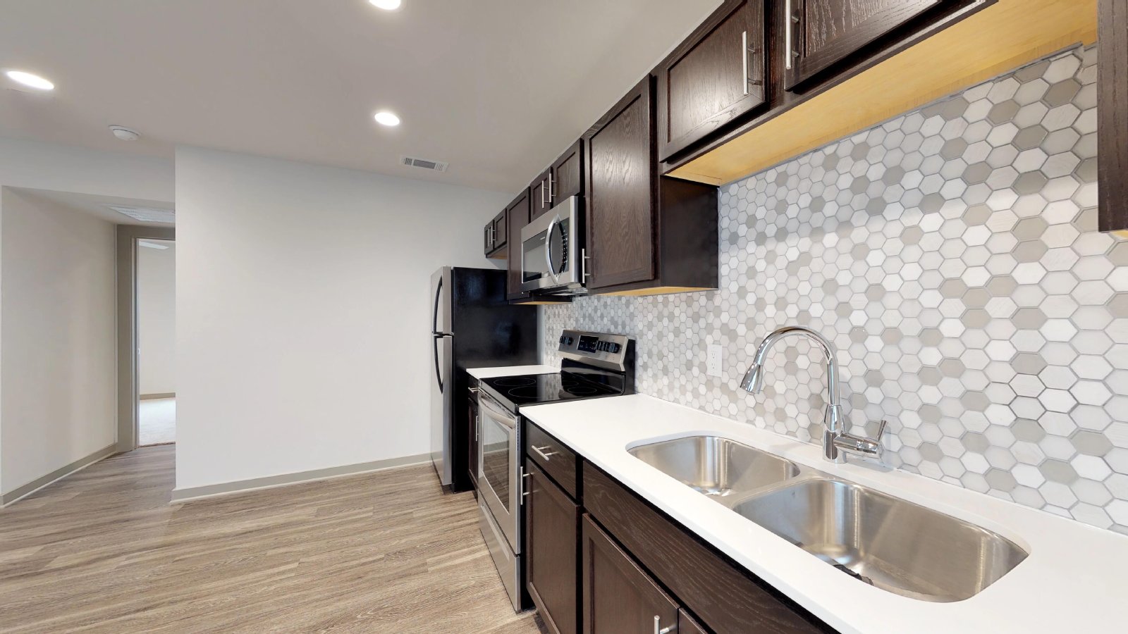 A1-A is a one bedroom unit with one bathroom. The spacious bedroom has two walk in closets with built ins. The bathroom features a shower over the tub. The kitchen and living room are open concept. The unit features highly valued amenities such as quartz countertops, stainless steel appliances, 5-burner cook top, faux wood plank flooring, walk-in closet, stackable washer/dryer, and spacious living quarters.
